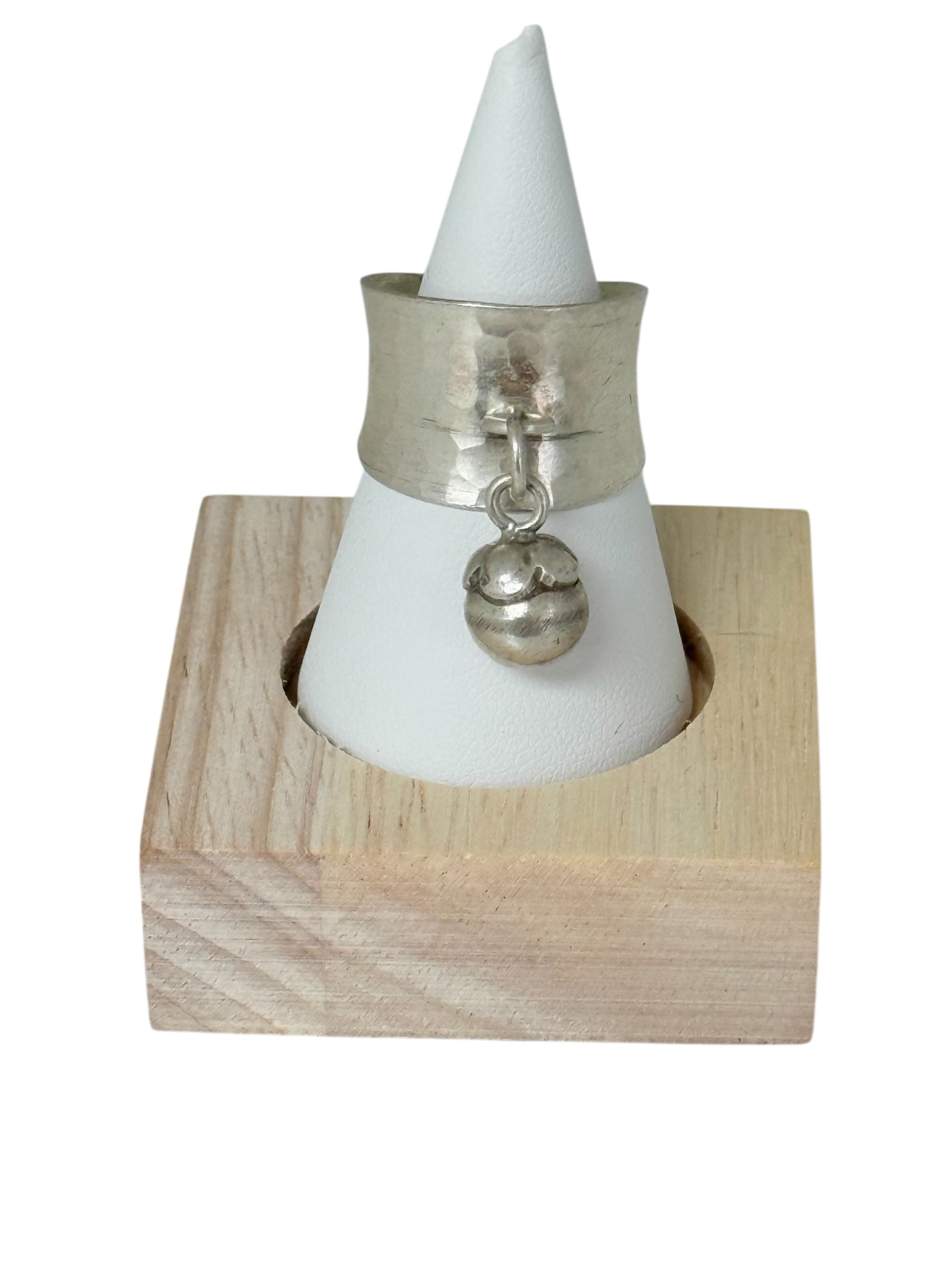 Bold and rustic, this wide-band hammered silver ring features a handcrafted finish and a dangling silver charm. It’s a perfect blend of modern edge and traditional craftsmanship, designed to make a statement.